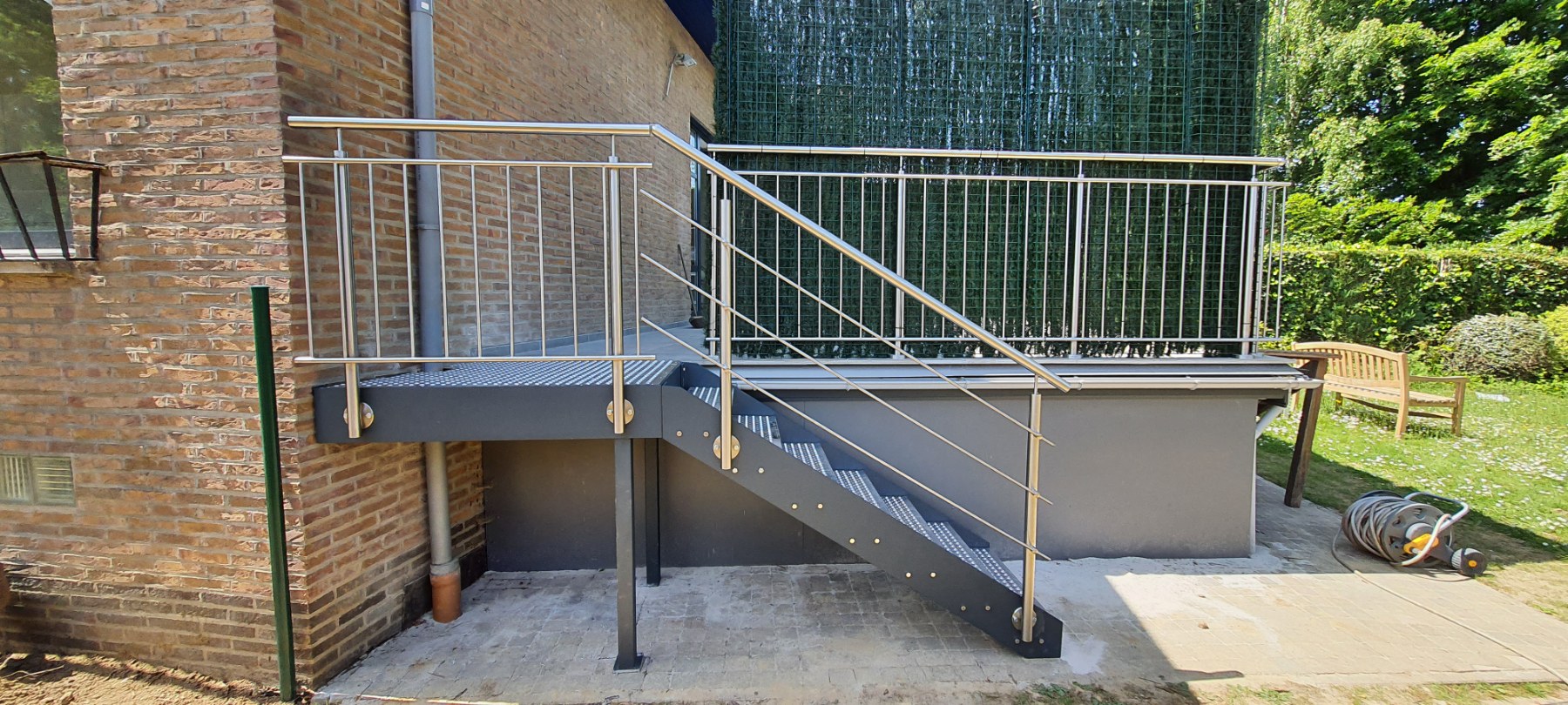 Escalier métallique extérieur avec structure acier thermolaquée et garde-corps inox.